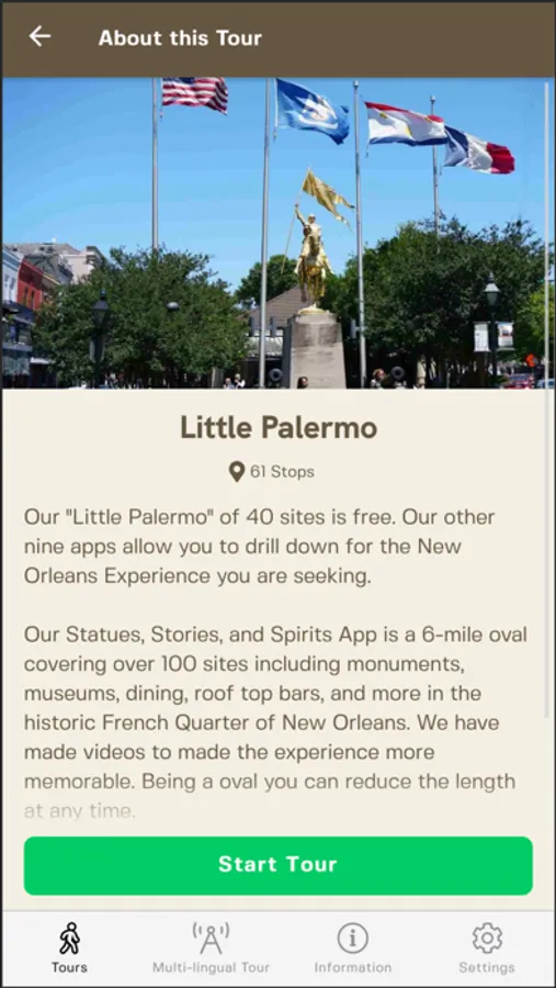 Our Statues, Stories, and Spirits Tour is a 6-mile oval covering over 100 sites including monuments, museums, dining, rooftop bars, and more in the historic French Quarter of New Orleans. We have made videos to make the experience more memorable. Being an oval you can reduce the length at any time.