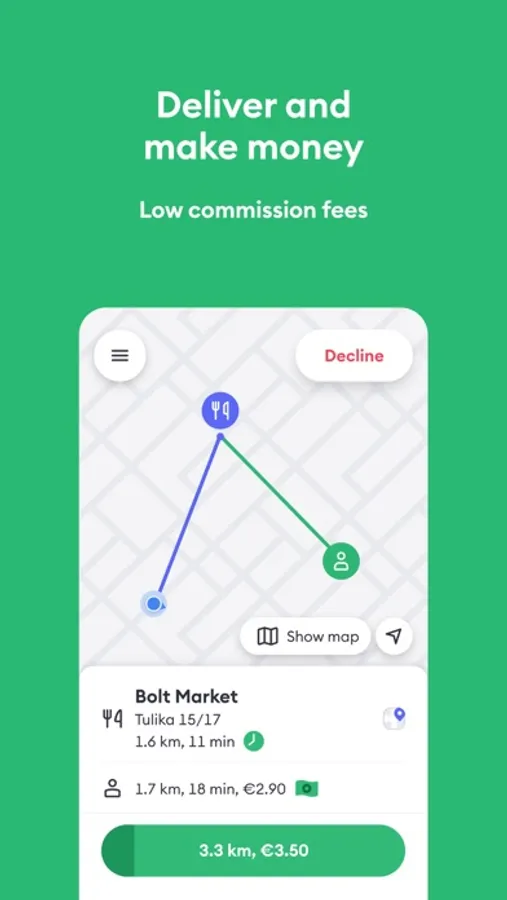 • Sign up to deliver inside the Bolt Courier app or at https://bolt.eu/food/courier;