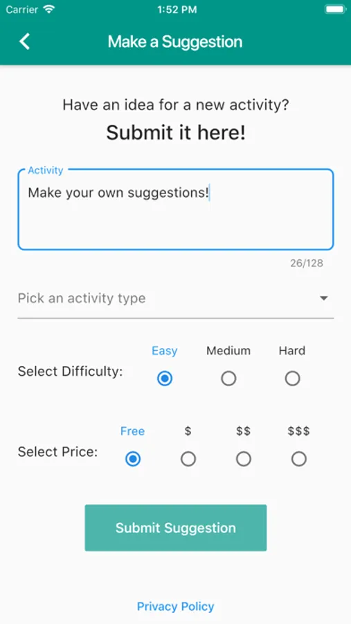 Have a suggestion for a task? Submit it through the app and we will add it to our database for other users to see!
