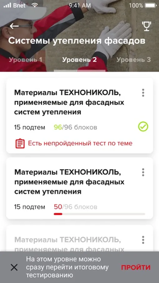 4 учебных программы разбиты на теоретические модули + упражнения для закрепления знаний. Правильно отвечая на вопросы и проходя темы, можно получить сертификат ТЕХНОНИКОЛЬ.