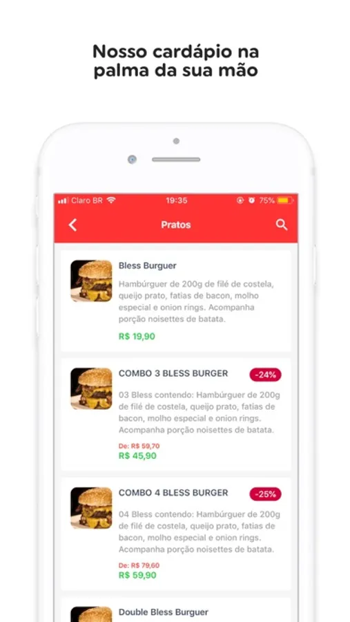 No app, você encontra de forma rápida o cardápio completo e ainda pode utilizar a ferramenta de busca para localizar diretamente os produtos que você deseja.