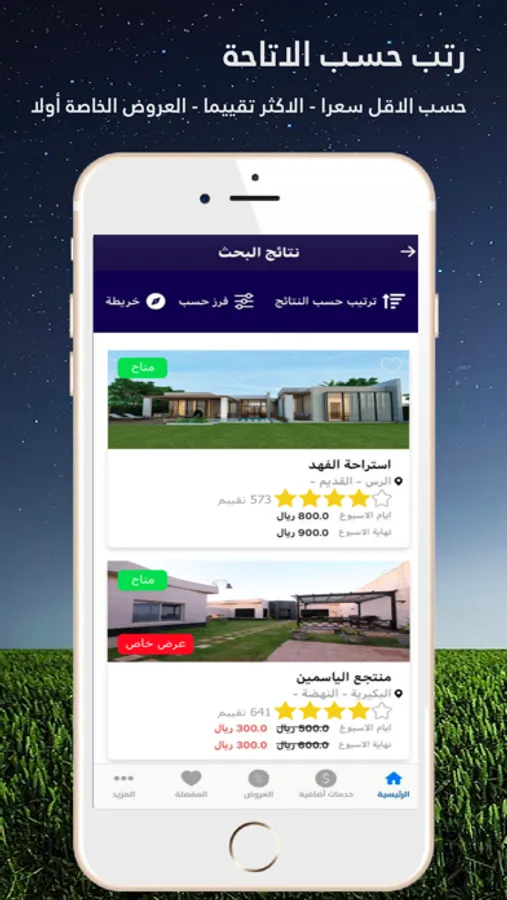 تطبيق شاليهات القصيم يظهر لك في صفحة النتائج بعد البحث كافة الشاليهات و العقارات الأخرى المطابقة لنتائج التي قمت بالبحث عنها مع مواصفات مختصرة على الصفحة الرئيسية منها السعر في اليوم المطلوب والعنوان والتقييم من قبل النزلاء السابقين في هذا الشاليه, كما يوفر لك خدمة الفرز حسب الأحياء و الترتيب حسب.