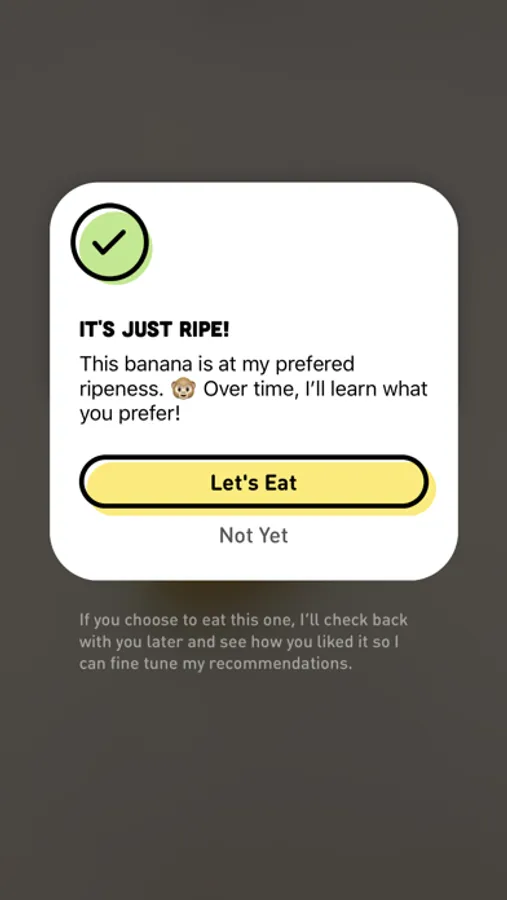 Tired of eating bananas that are not perfectly ripe?? How many hours of your life have you lost to eating unsatisfying bananas? 2? 57? 4,358?!?!? Never again, my friend! NannerScanner lets you know when a banana is ripe and learns your preferences over time, based on your feedback. With NannerScanner, you can peel with passion and consume with confidence!