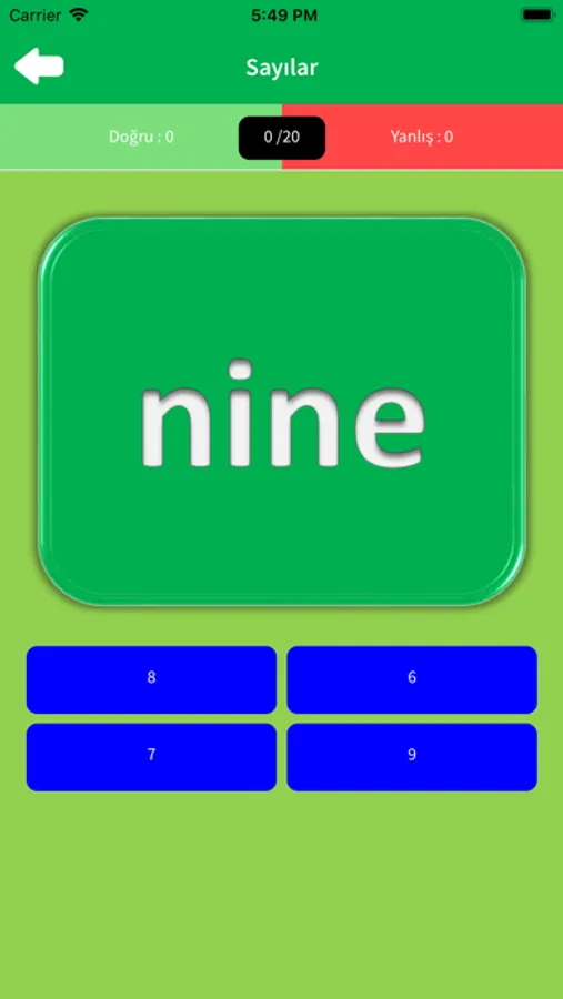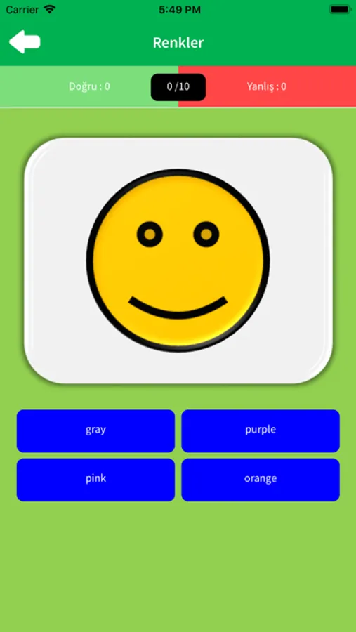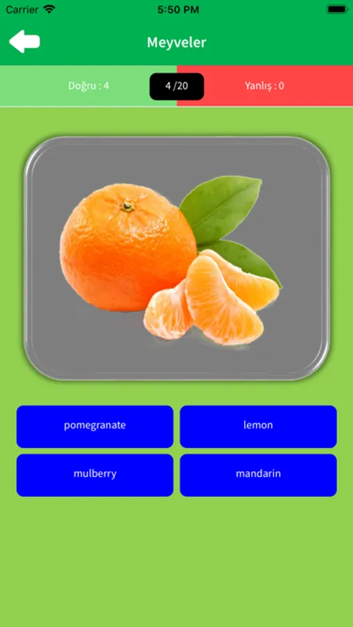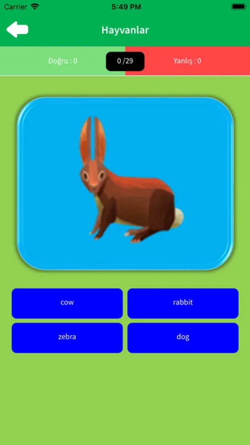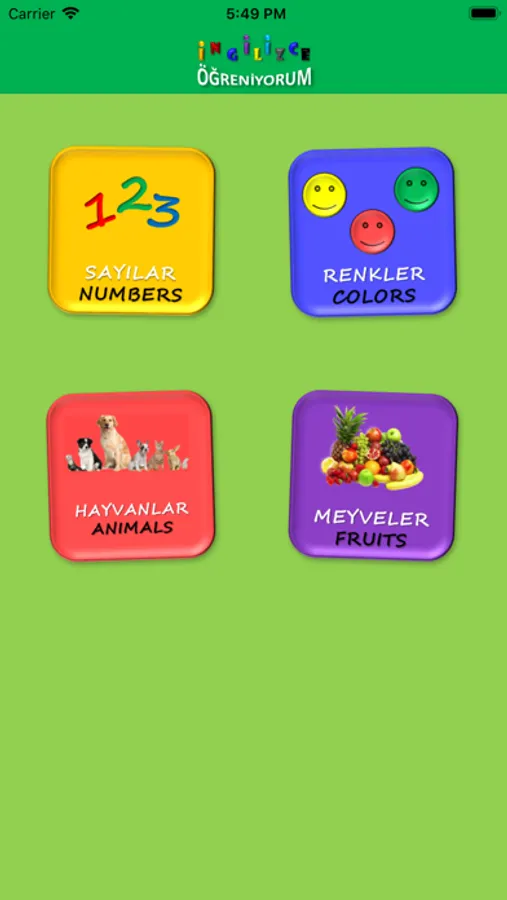 Temel ingilizce eğitimi için sayılar, renkler, hayvan ve meyveleri bir oyun ile öğretmeyi sağlar.
