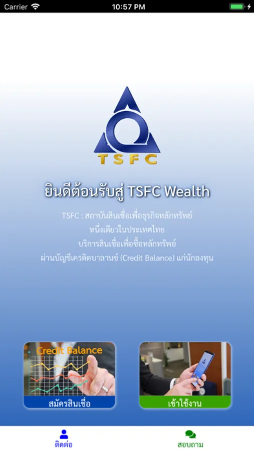 TSFC Wealth แอพพลิเคชั่น จากบริษัทหลักทรัพย์ เพื่อธุรกิจหลักทรัพย์ จำกัด (มหาชน) – TSFC : สถาบันสินเชื่อเพื่อธุรกิจหลักทรัพย์ หนึ่งเดียวในประเทศไทย ได้จัดทำไว้ให้บริการแก่ลูกค้าสินเชื่อกู้ยืมเงินเพื่อซื้อขายหลักทรัพย์ ประเภทมาร์จิ้นในระบบเครดิตบาลานซ์ (Credit Balance) เพื่อเพิ่มความสะดวกและรวดเร็วในการติดต่อกับบริษัท