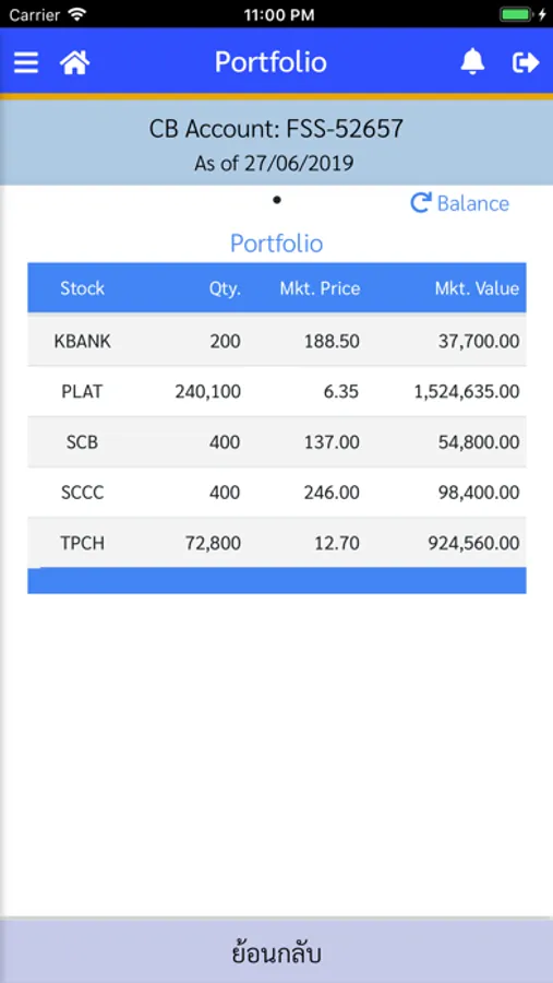 • แสดงสถานะบัญชี ข้อมูล Cash Balance, LMV, Margin Balance, Equity, Excess Equity, EE Withdraw, Credit Line และพอร์ตการลงทุน