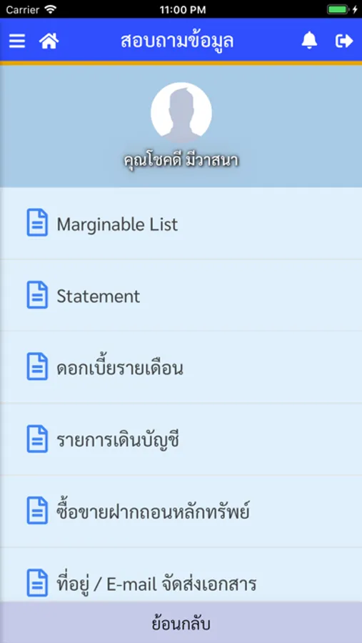 • แสดงข้อมูล Marginable List, ดอกเบี้ยรายเดือน, รายการเดินบัญชี, รายการซื้อขายฝากถอนหลักทรัพย์ และที่อยู่/E-Mail จัดส่งเอกสาร