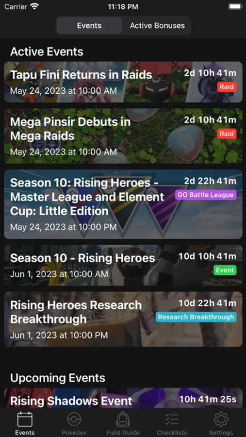 • Events: Browse through a list of current, upcoming and past events, see the various bonuses and set custom notifications for event starting dates.