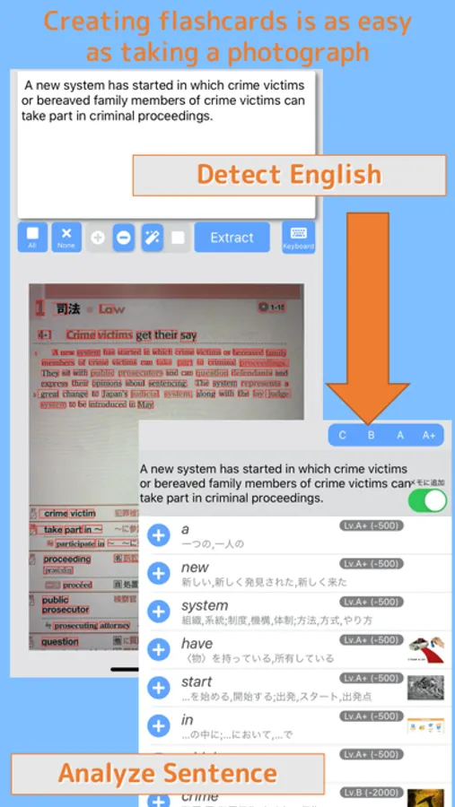 ・The app can extract all English words from a photo and create flashcards for each, allowing you to make new cards simply by photographing a textbook.