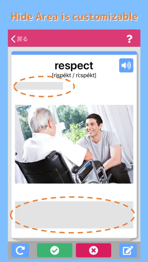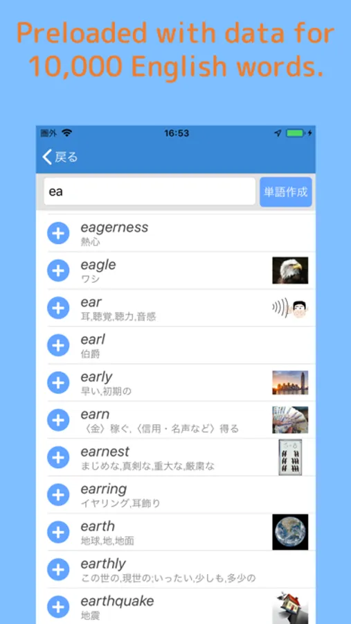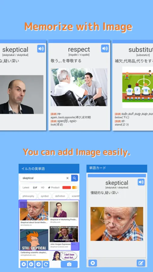 You are free to add only the words you wish to remember, and the Japanese translation, imagery and other data can all be customized. For imagery, you can take screenshots of websites or use other pictures that will make the card easy to remember.