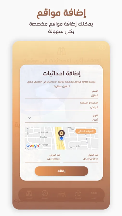 • بالاضافة الى المواقع الموجودة في التطبيق، يمكنك إضافة احداثيات مواقع مخصصه لك لتتصفحها في المستقبل بكل سهولة.