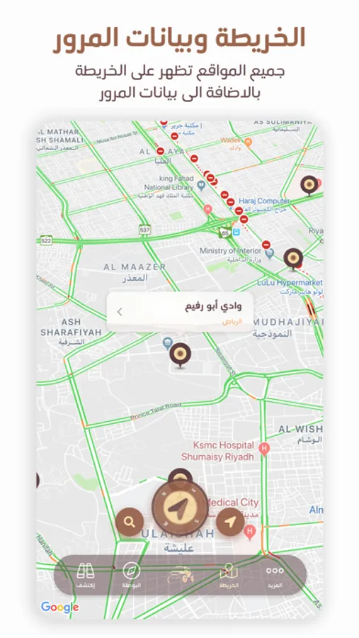 • ايضا ستتمكن من خلال خريطة دليلة البر معرفة الشوارع و المناطق المزدحمة من خلال خدمة بيانات المرور.