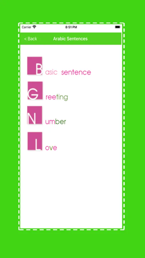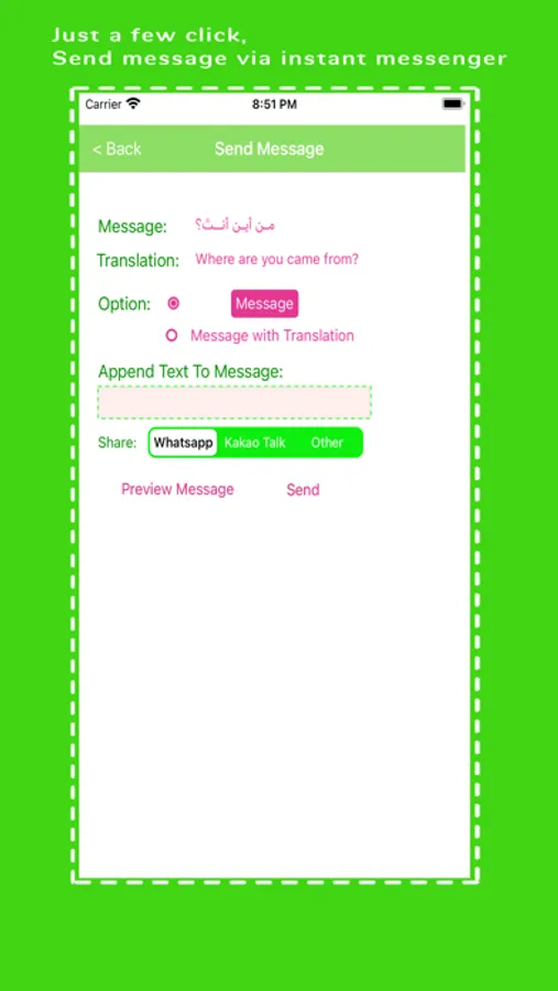 There are three categories which allow user to send messages in Arabic such as basic sentences, greeting and love.