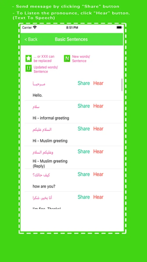 1) Some Arabic basic words / sentences eg hello ...... can be shared via instant messenger
