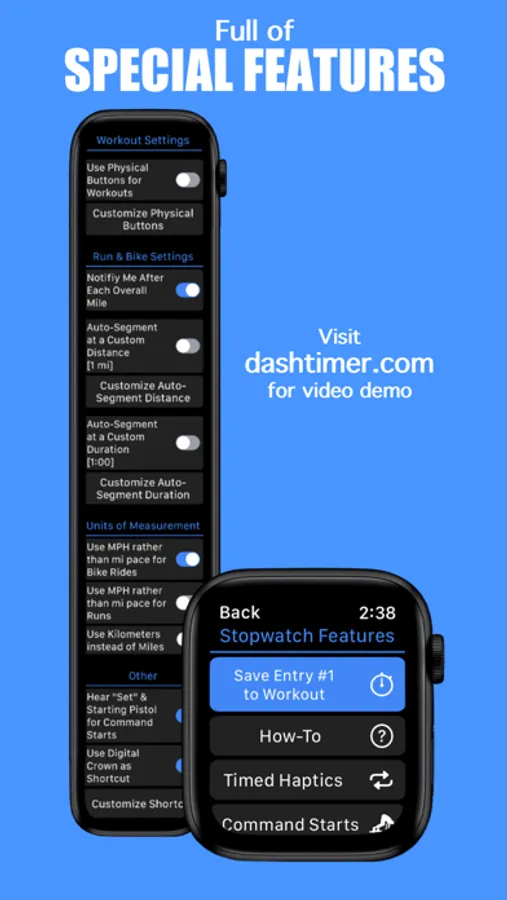 - COMPLICATIONS: Dash Timer's complications can launch the app from your favorite watch face and use a status ring (or text) to update you on the status of your workout. Depending on space, some complications can even show up to 3 workout metrics.