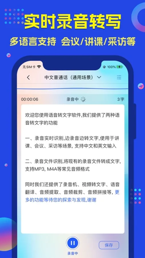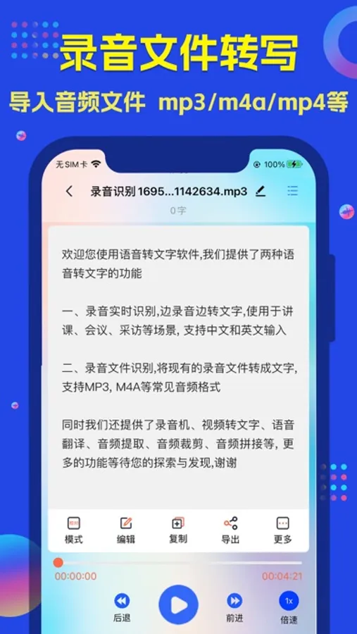 语音识别助手是一款苹果手机语音转化软件,支持实时语音转化与导出出功能,是我们文字录入、语音转换、在线翻译、音频文件识别的必备软件,实现了边说边记,高效录入的效果,提高办公效率。是一款语音转文字工具类APP。