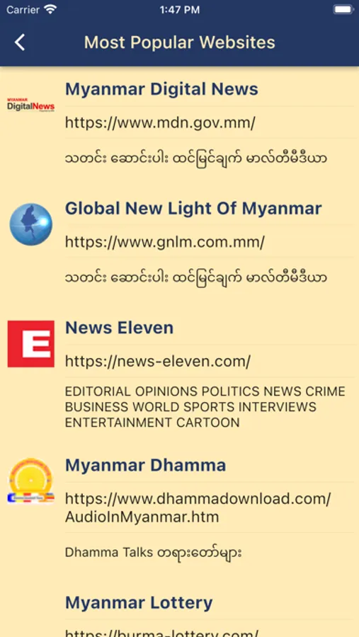 We have compiled some commonly used websites in Myanmar for you, including news, shopping, jobs, renting houses, online shopping, Buddhist scriptures, gold price inquiries, lottery inquiries, yellow pages, sports, etc.