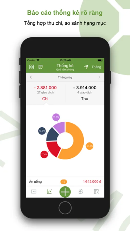 + Báo cáo thống kê rõ ràng theo thu chi, hạng mục và đối tượng, có thể gửi qua email