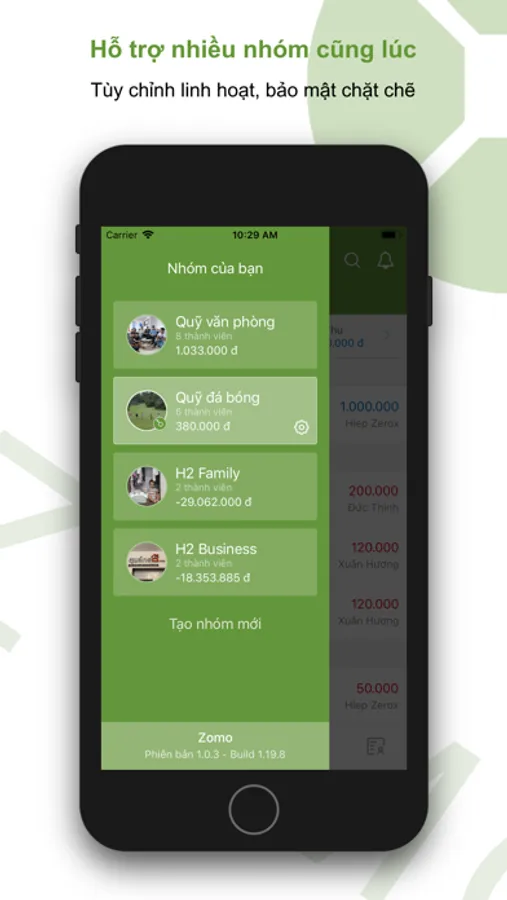 Zomo là ứng dụng giúp mọi thành viên cùng quản lý tiền nhóm một cách dễ dàng, tiện lợi, an toàn và công khai minh bạch. Mọi người nếu có quyền đều có thể nhập thu chi và ghi chú vào quỹ tiền chung. Khi có phát sinh thì có thông báo tức thời đến mọi người trong nhóm. Mọi thành viên mọi lúc mọi nơi đều có thể xem được số dư và báo cáo chi tiết các giao dịch trong quỹ nhóm của mình.