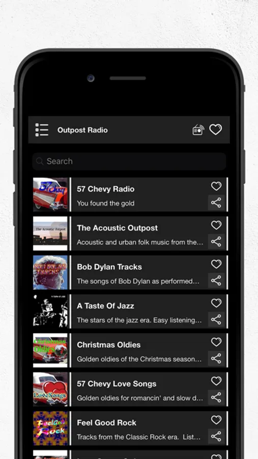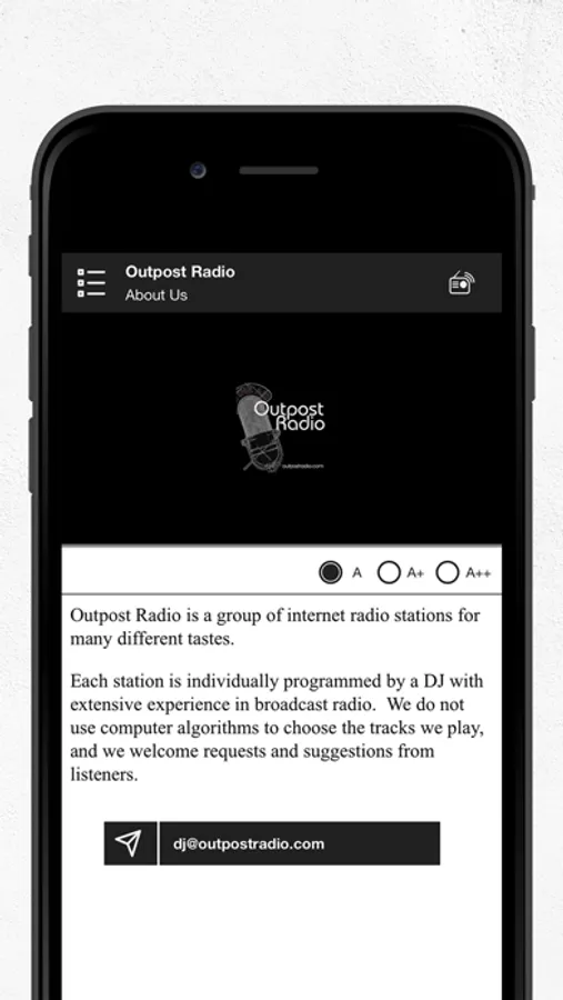 The Outpost Radio app provides a group of internet radio stations with many styles of music. Each station is individually programmed by a DJ with extensive experience in broadcast radio. We do not use computer algorithms to choose the tracks we play, and we welcome requests and suggestions from listeners.