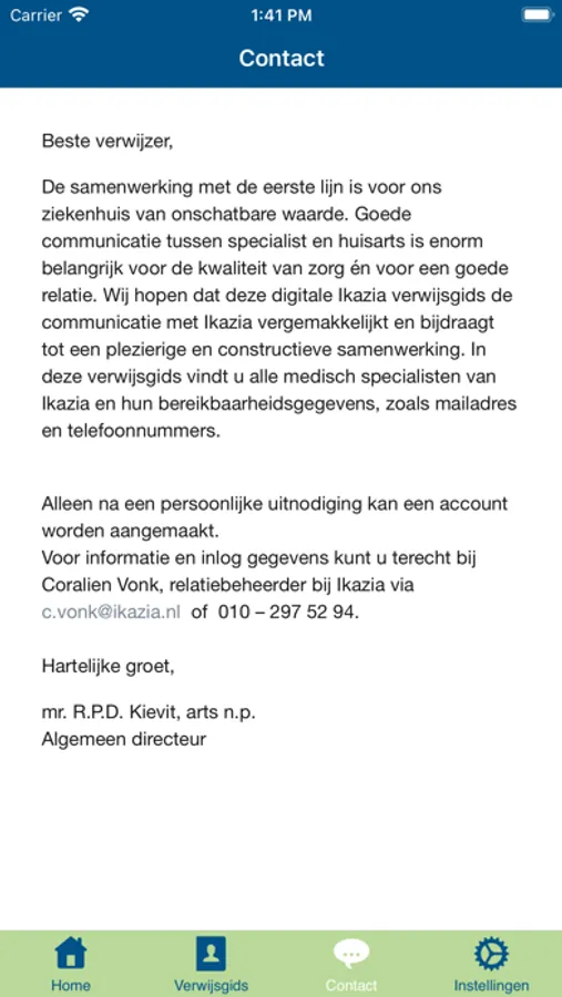De samenwerking met de eerste lijn is voor ons ziekenhuis van onschatbare waarde. Goede communicatie tussen specialist en huisarts is enorm belangrijk voor de kwaliteit van zorg én voor een goede relatie. Wij hopen dat deze digitale Ikazia verwijsgids de communicatie met Ikazia vergemakkelijkt en bijdraagt tot een plezierige en constructieve samenwerking. In deze verwijsgids vindt u alle medisch specialisten van Ikazia en hun bereikbaarheidsgegevens, zoals mailadres en telefoonnummers.