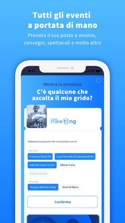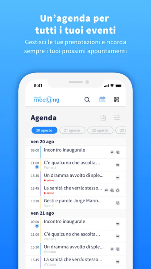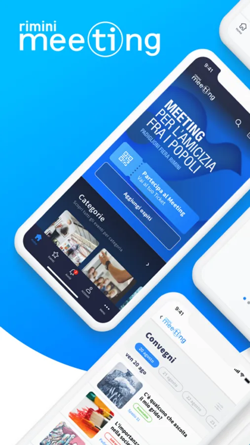 The official ‘Meeting Rimini’ app allows you to fully experience one of the world's greatest summer events with culture, exhibitions and shows. With the app, you will be able to enter the Rimini Fair from 20 to 25 August, by using the QR code generated after entering your data. You can use the app before and during the Meeting to book events and visits to the exhibitions, consult the programme by selecting specific thematic filters, read the latest news and create your personal agenda with your MyMeeting account... The app will then keep you updated on our activities and proposals throughout the year!