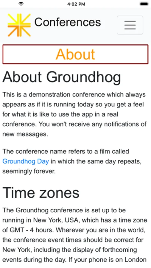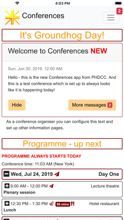 The app shows the programme for the events in the chosen conference, with the home screen updating to show the current and next events. The app gets time zones right, so if your phone is on UK time but you are attending a conference in New York, it displays the forthcoming events correctly.