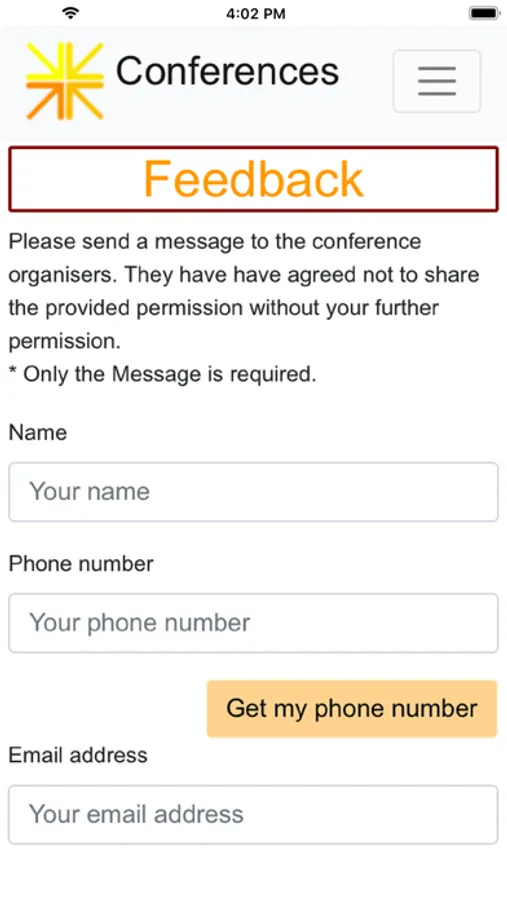 The conference organiser will have configured a feedback screen and set up information pages such as Directions, Sponsors and About the conference.