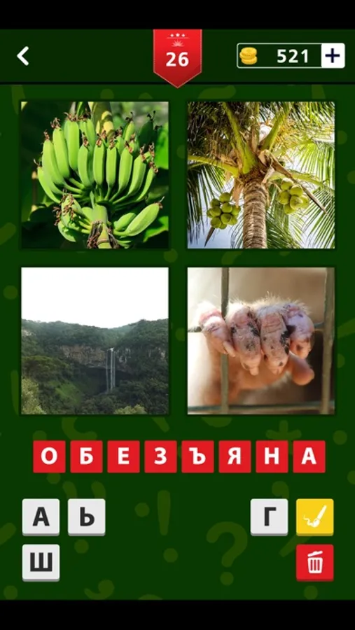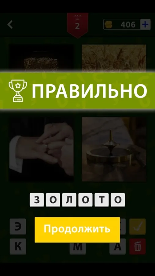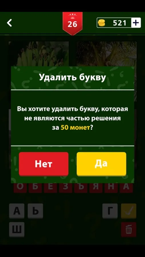 С помощью заработанных подсказок в игре 4 картинки 1 слово можно убрать лишнюю букву из списка или открыть одну букву в слове, описывающем 4 картинки.