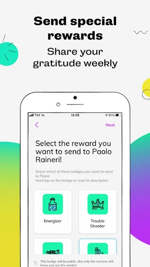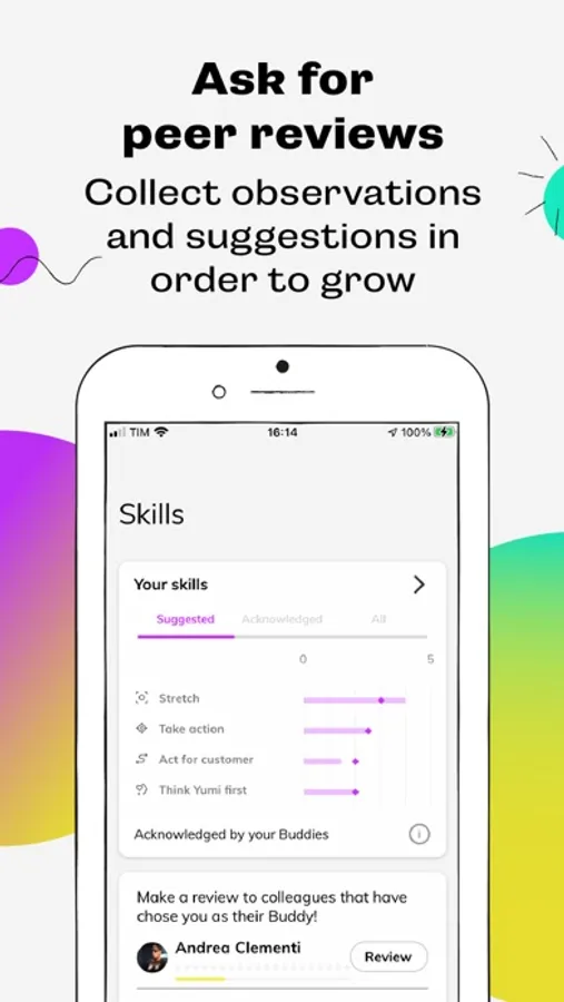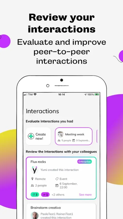 Yumi encourages the adoption of new values and behaviors within the team, applying a new paradigm to business realities, through a peer-to-peer approach of digital nudging and through continuous motivations and data collected through the app under the full control of the user: individuals and teams receive from their professional ecosystem (colleagues, customers, suppliers, managers) the information they need to evaluate and understand their professional impact and the actions to be implemented to improve it.