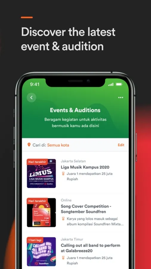 Challenge yourself with Soundfren through exclusive auditions and competitions to amplify your music journey by exposing yourself through stage performance opportunities. No idea where you might end up performing this weekend? Find out here!