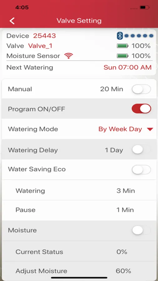 • Manual settings from the App is simple task (Manual watering in 1 minute increments up to 360 minutes)