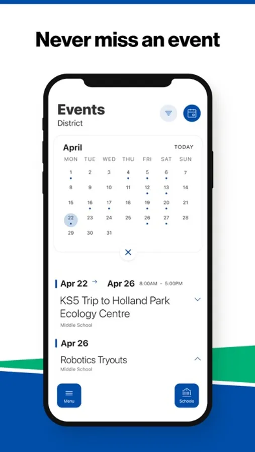 The event section shows a list of events throughout the district. Users can add an event to their calendar to share the event with friends and family with one tap.
