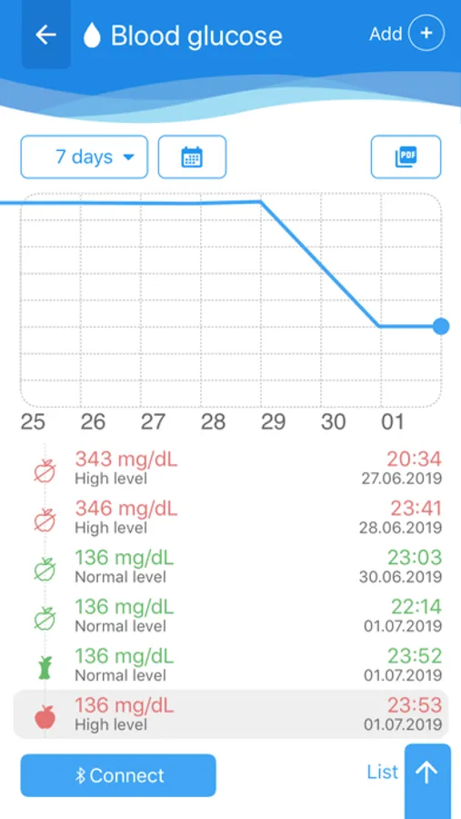 - easy results interpretation and a better understanding of Blood Glucose Levels thanks to the color range indicator of measurements