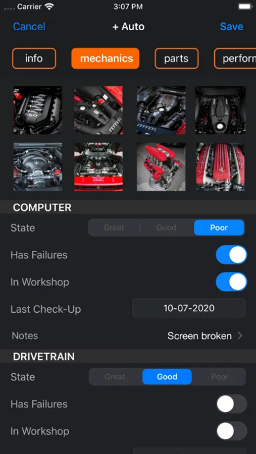 Thanks to iCloud support, Autochek helps owner's keep a tight control of their Auto information at all times. This was done through a well designed UI navigation and complex database features.