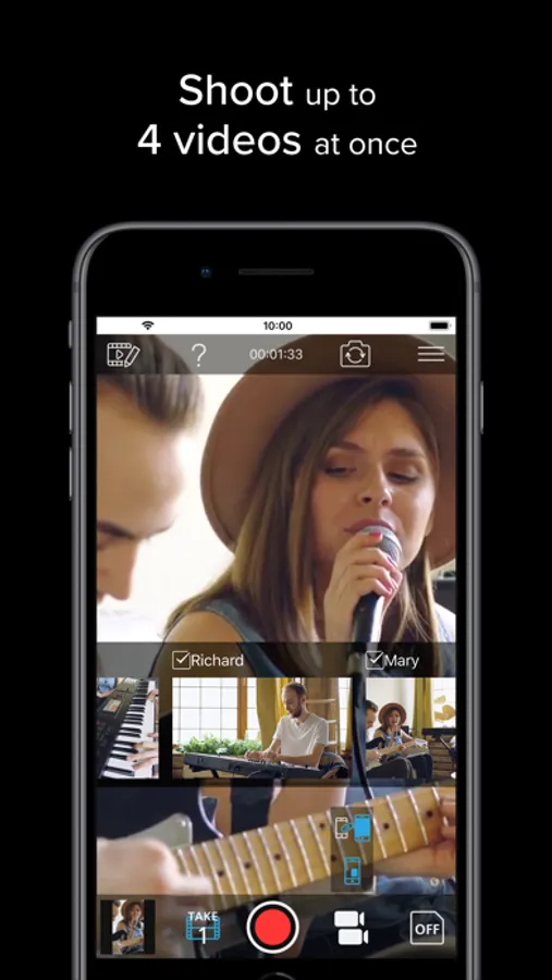 Capture up to four different camera angles simultaneously by connecting your iPhone or iPad and up to three additional iOS devices. Combine wide shots of the entire band with close-up shots of each member for impressive, dynamic results. And since all cameras are controlled by your iOS device, you can shoot a multi-angle video in one take, all by yourself.