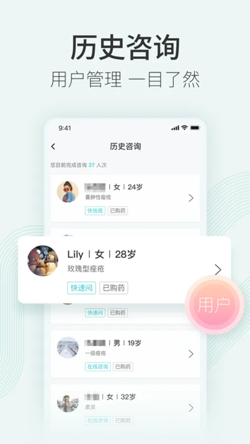 【咨询报告】医生可新增病种,选择药房,添加再次咨询时间,开具药品,可修改咨询报告;【用户管理】已解决皮肤问题的用户咨询记录,回访查看一目了然;