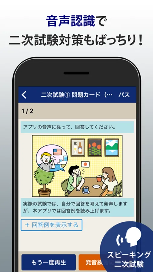 二次試験、面接のパートでは、発音の即時採点機能でスピーキングの練習ができます。