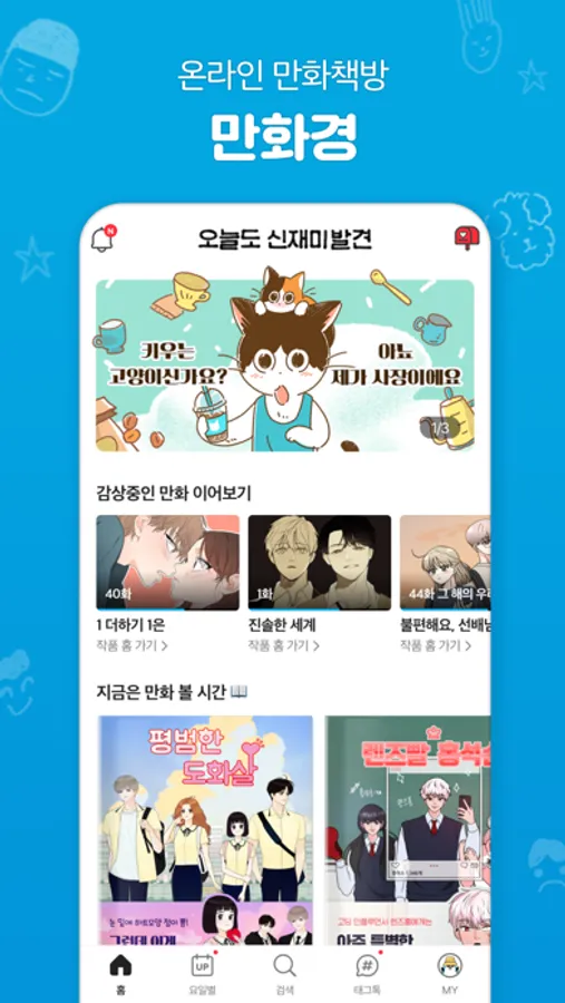 일상툰부터 장르별 웹툰까지, 틈틈이 꺼내보기 좋은 만화가 가득! 오직 만화경에서만 볼 수 있는 만화들로 '신재미'를 발견해보세요.