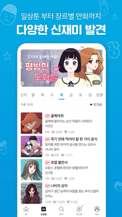 100만 뷰를 달성한 인기 웹툰부터 시작해 보세요. 지루할 틈이 없어요!
