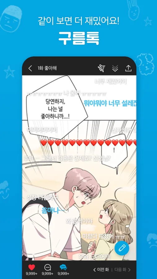혼자보기 아까운 장면을 발견했다면, 내 댓글을 구름처럼 띄워보세요. 실시간으로 다른 독자들의 반응도 볼 수 있답니다.