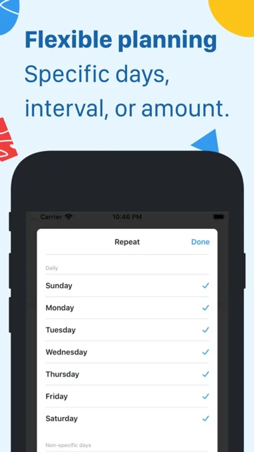 • Flexible planning: Do habits by specific days, interval, or amount.