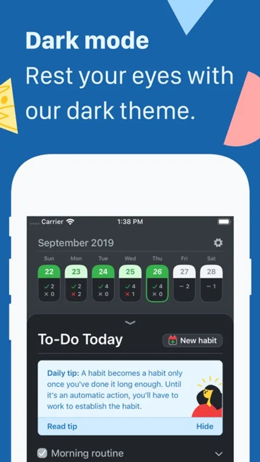 Making changes to our lives can be a daunting task. Habitual is designed from science-based principles to make you feel motivated to build habits and stick to them. With the help of motivating streaks, daily advice, and friendly reminders, the daunting task of forming new habits will soon be a breeze.