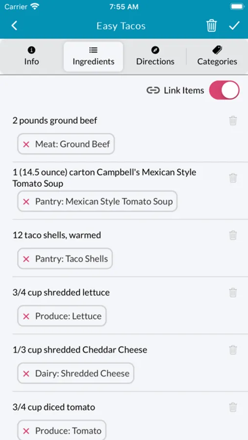 • Link a recipe to the meal to then be able to quickly add items that you need to your shopping list.