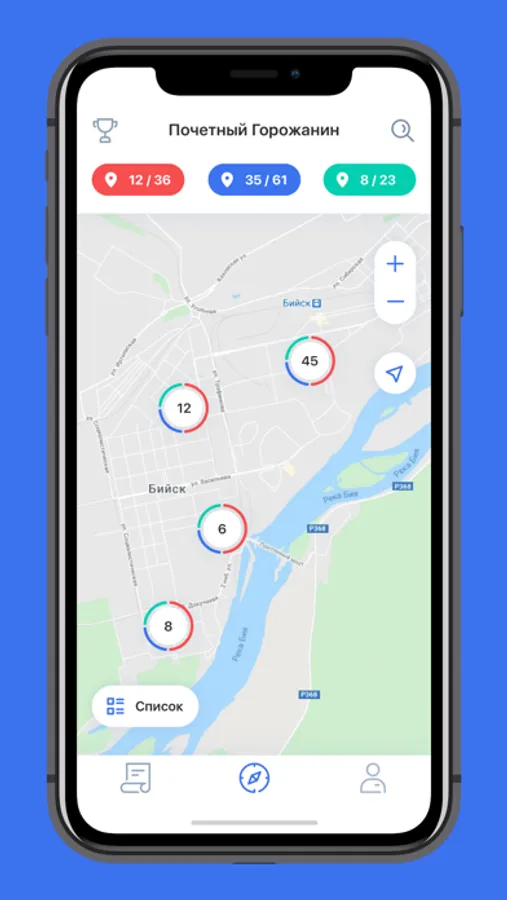 Объекты подразделяются на три группы: красные, синие и зелёные в зависимости от тематической принадлежности и популярности. Открыв определенное количество мест, ты проходишь очередной Уровень или получаешь стикер за соответствующее Достижение.