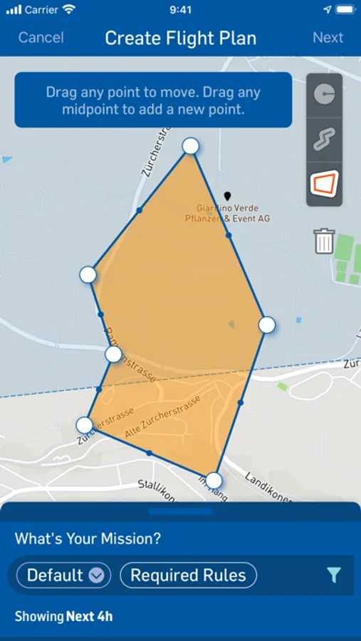 - Plan the drone operations in time and space, by setting specific date, time, duration, as well as intended airspace in terms of trajectory or area and the height above terrain.