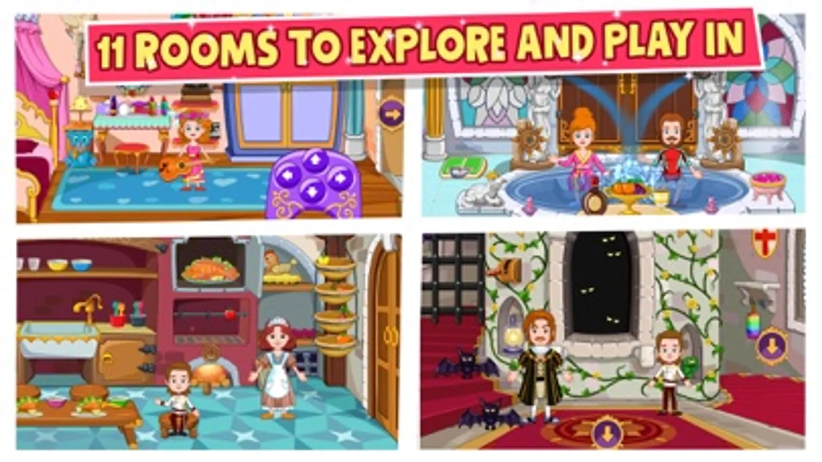 - Huge castle with lots of rooms to explore and secrets to discover. Try tapping both unicorns at the castle's entrance.