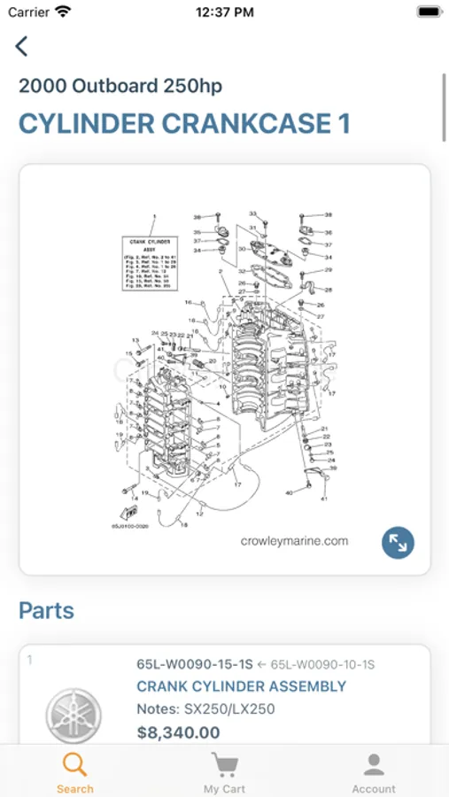 The Crowley Marine app is the easiest way to lookup spare OEM parts for your outboard motor. Whether you have Johnson, Evinrude, Yamaha, Mercury or Suzuki you can find parts diagrams, product photos, tech articles and more.