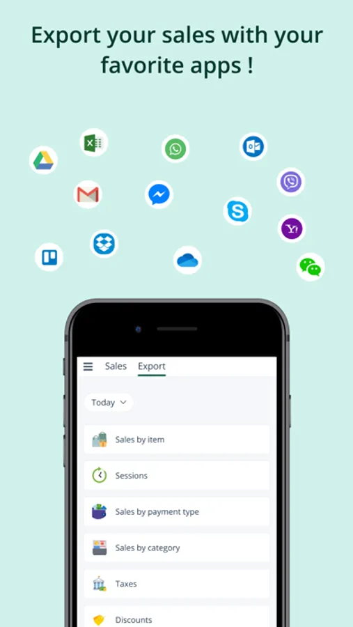 • Export all your sales in Excel format via Gmail, Whatsapp, Messenger, Outlook, Drive, Dropbox or SMS or any other application of your choice
