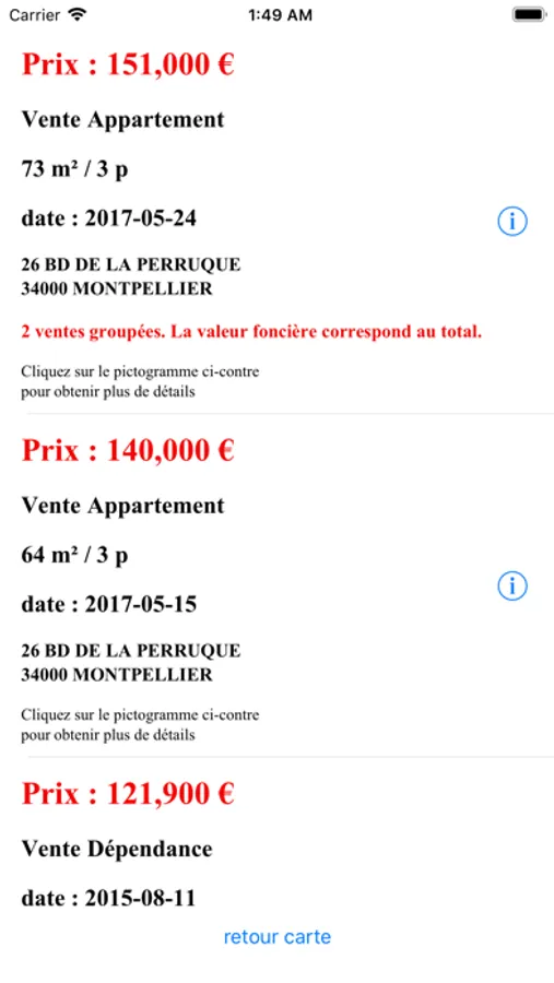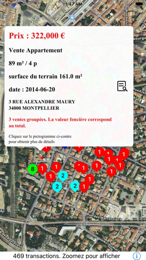 Le prix affiché des transactions dans l'application est "net vendeur", c'est-à-dire ne comprenant ni frais d'agence immobilière, ni frais de notaire. En cas de vente de mobilier (une cuisine équipée par exemple) avec le bien immobilier, le montant de ce mobilier n'est pas compris dans le prix indiqué.